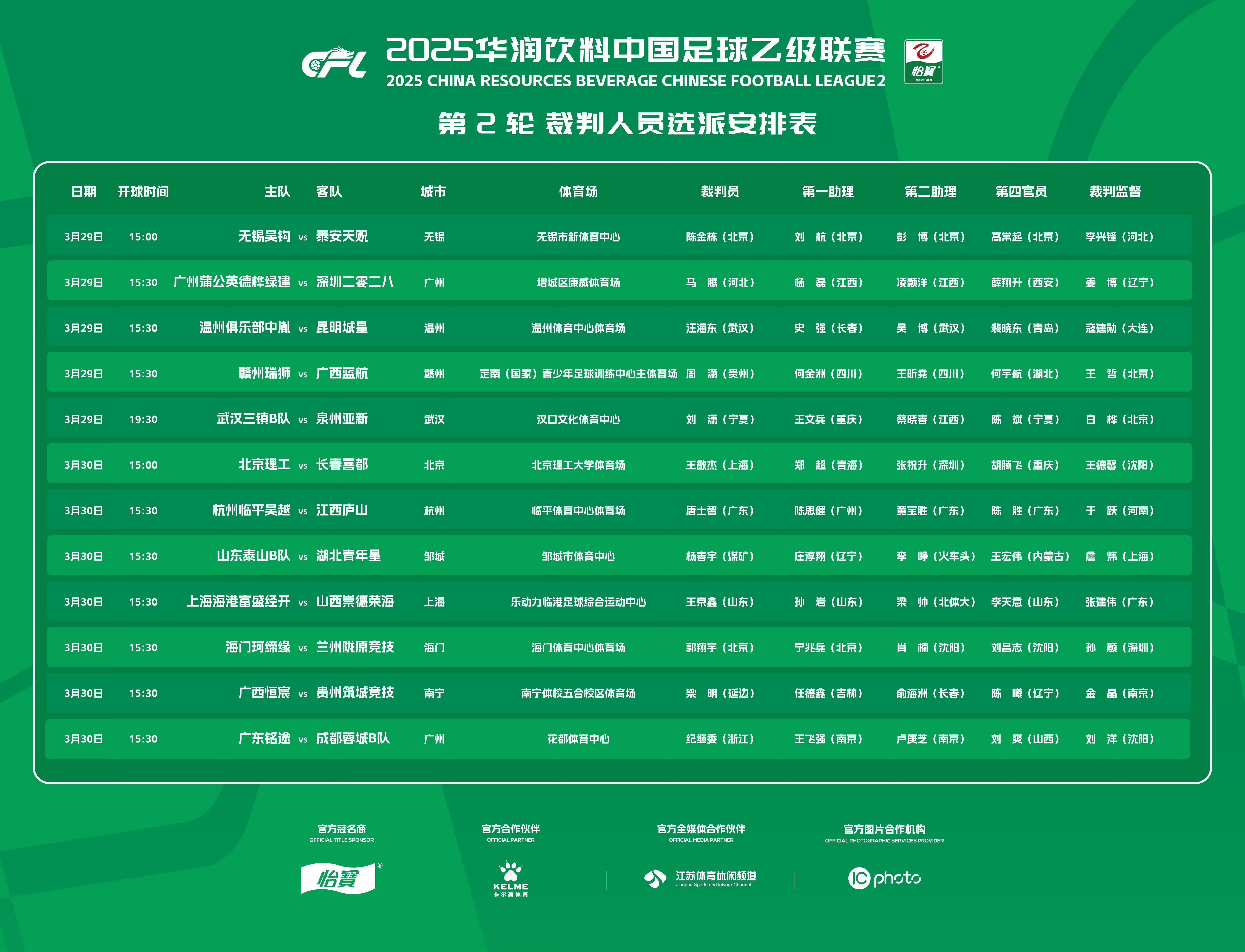 中乙第2轮裁判:马腾执法广东德比广州蒲公英vs深圳二零二八